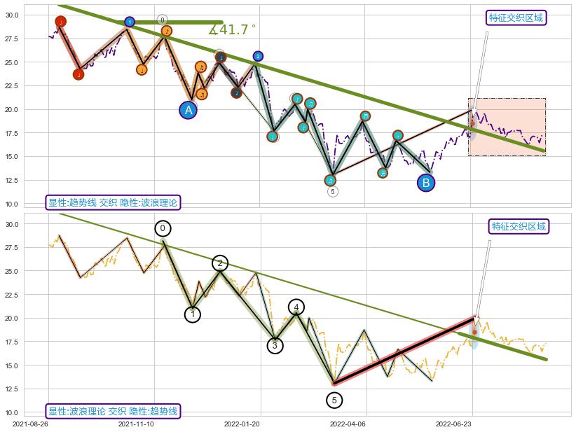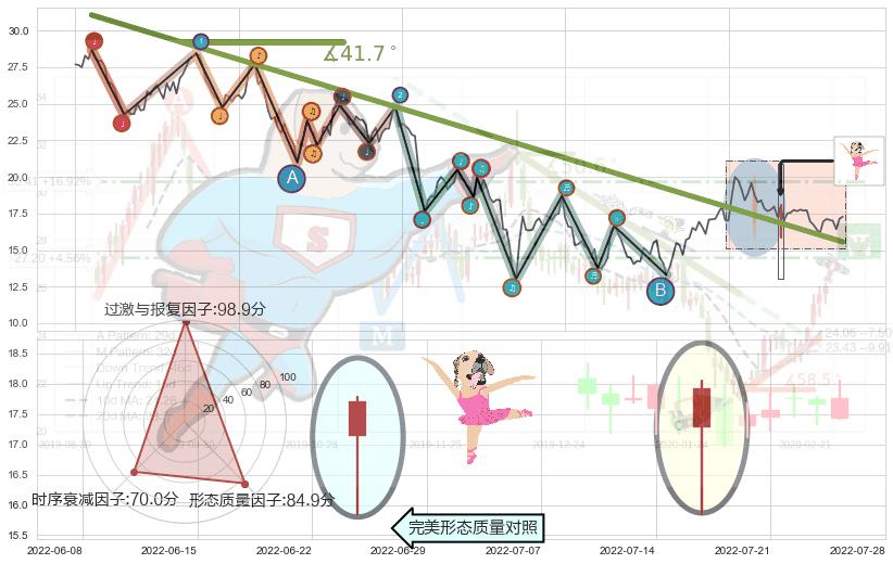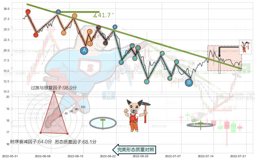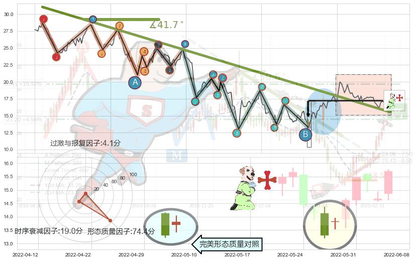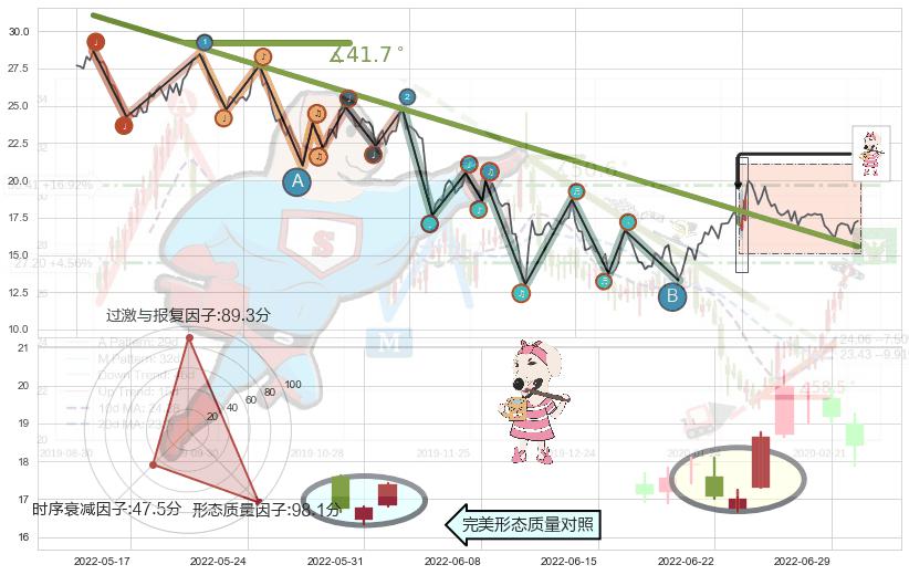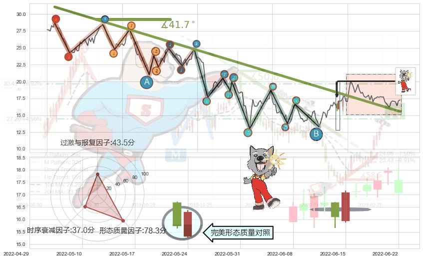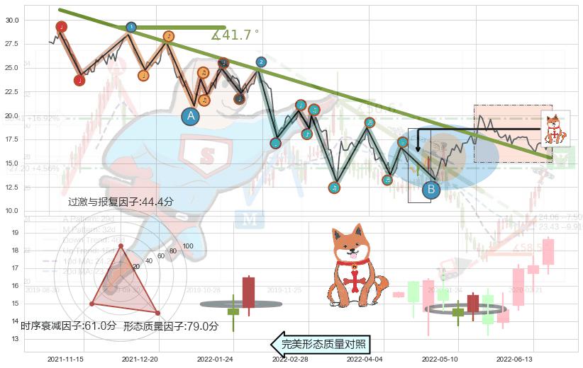 ➢ 2021-09-02-2022-06-15下跌趋势存在反转上涨[机会],其原下跌趋势的阻力位(15.56)已被突破[强支撑信号],原下跌趋势角度: 41.7˚