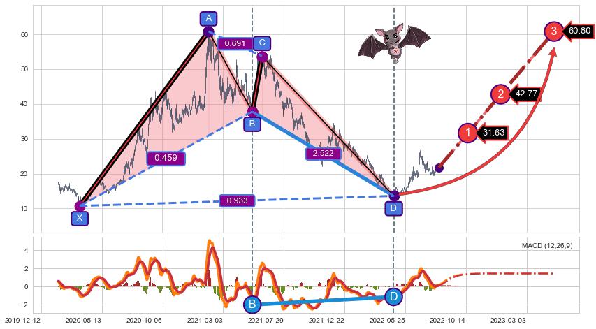 ➣ 谐波蝙蝠:c下跌到达d:猜想拉升 → 上涨 →【拐点】强支撑临近 → 大趋势均值回复