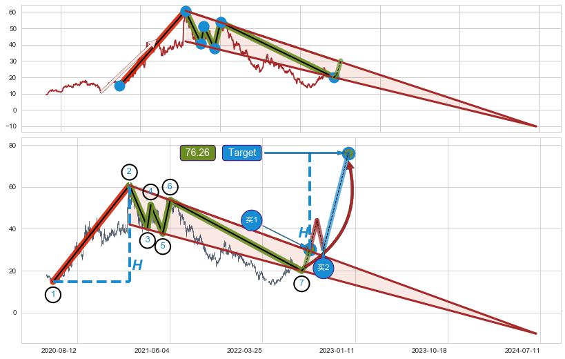 ➢ 降楔型:猜想临近关键阻力位突破点 → 临近拐点上涨 → 机会信号 → 大趋势均值回复