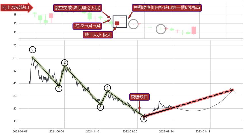➢ 突破缺口形成后,后续k已经超过14根,跳空突破波浪理论(5浪)关键点后, 出现【完全回踩】迹象,短期收盘价回补缺口第一根k线高点