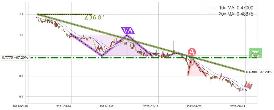 ♘ 在最后的下跌阶段2021-06-04至2022-08-12,存在 持续未破位的阻力位 ,阻力价格0.6380,可信任强度87.84%,其距离最后价格0.46500相差 +37.20%