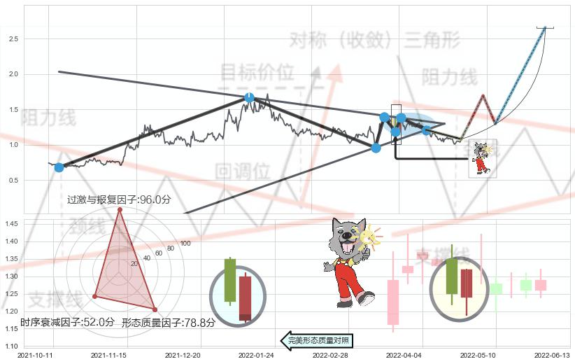 ➣ AI智能: 预测【多空区域上下窄幅震动→价格波动日益狭窄→多方占优】对称三角形中继整理向上突破,预测将在2022-06-16突破颈线, 演变成上升通道