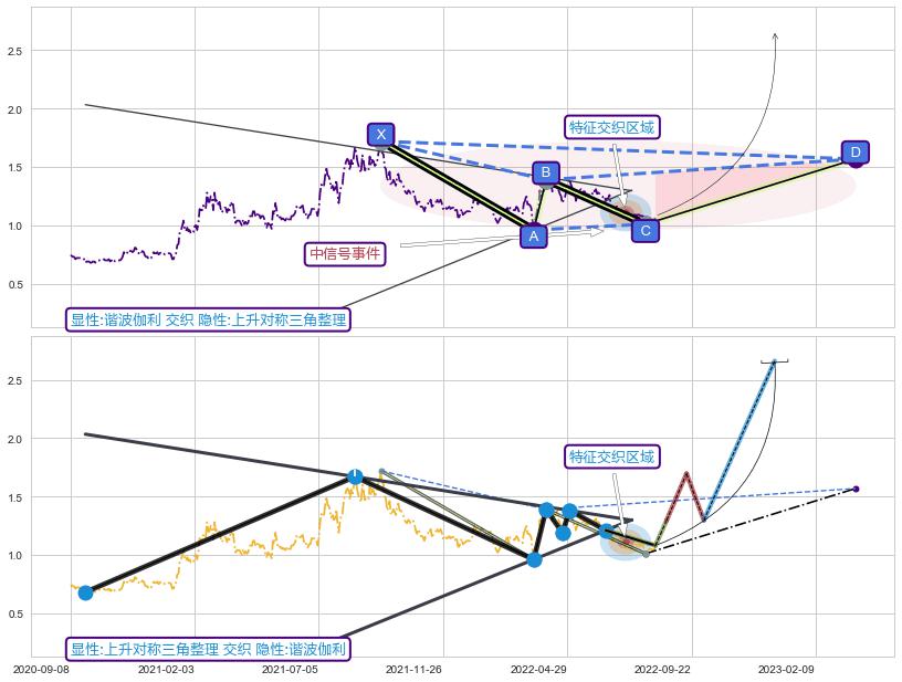 ➢ 谐波伽利属【中级别信号事件】上升对称三角整理属【长级别信号事件】中长周期组合信号事件,中长事件长度比52.86%