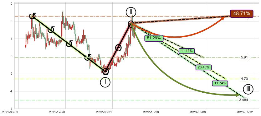 ➢ 循环浪继续向下【最高】位置(2023-03-02, 5.91),匹配聚类样本比例21.74%, 可能性概率11.15%