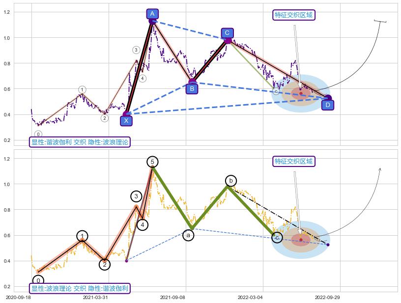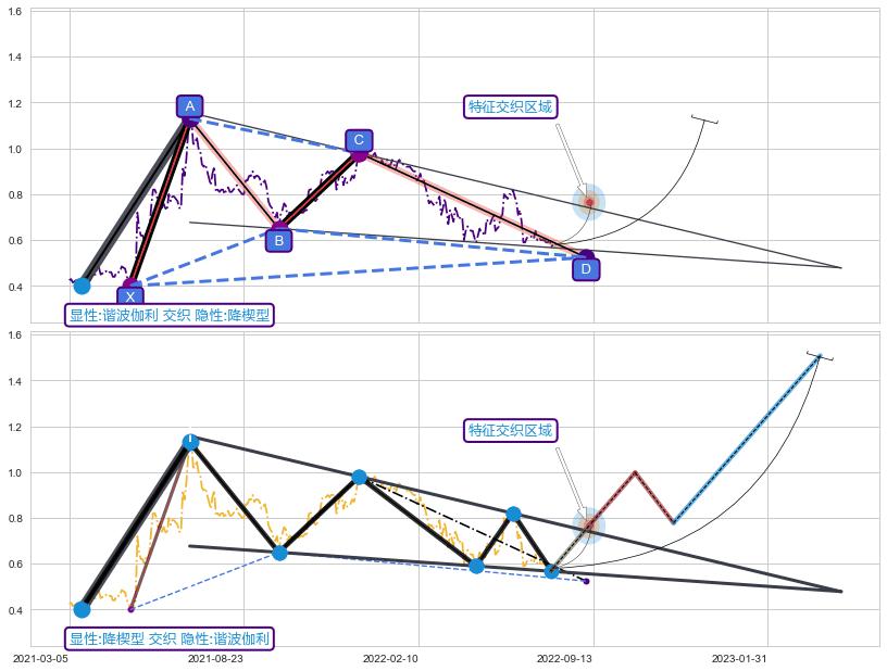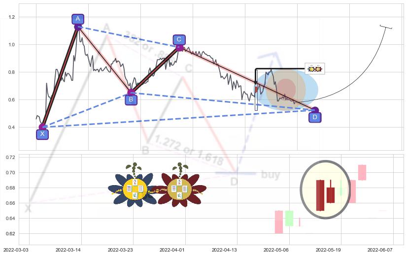 ➢ 谐波伽利:c下跌临近d:猜想拉升 → 上涨 →【拐点】强支撑临近 → 大趋势均值回复