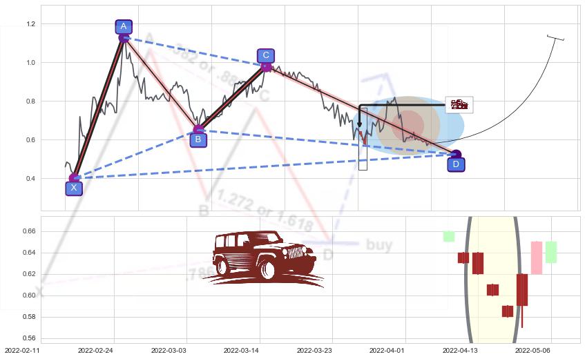 ➣ 谐波伽利:c下跌临近d:猜想拉升 → 上涨 →【拐点】强支撑临近 → 大趋势均值回复