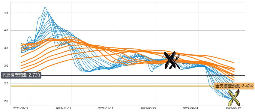 ➣ 60小时均线于(2022-04-22: 3.192)形成【死叉】基于【死叉历史模型】预测死叉后最低波谷价格: 2.711, 死叉后最低价格1.9800,已经下跌超出预测最低波谷价格, 预期反弹