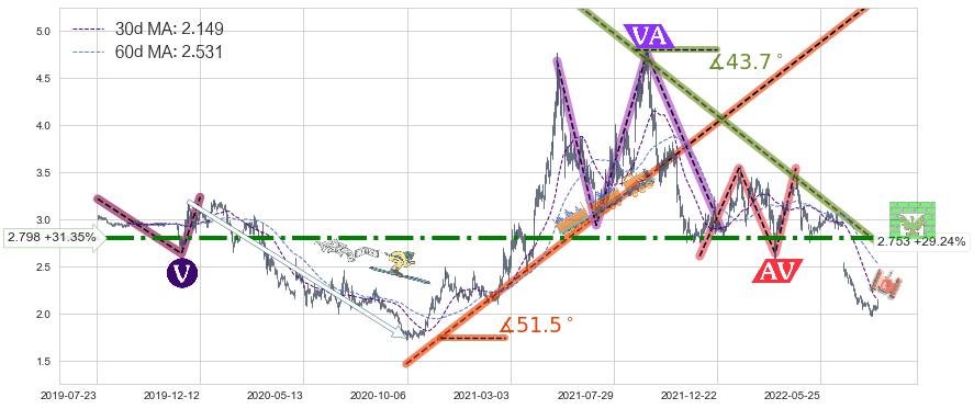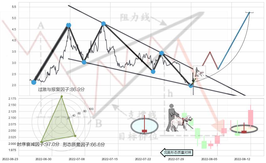 ♘ 阻力价格位2.798,可信任强度72.69%,距离最后交易2022-08-12形成的收盘价格2.130相差 +31.35%