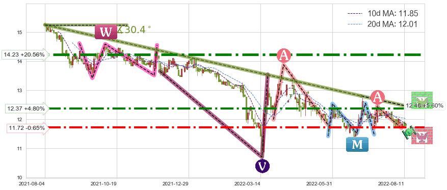 ♘ 阻力价格位14.23,可信任强度92.95%,距离最后交易2022-08-12形成的收盘价格11.80相差 +20.56%