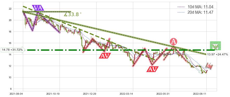 ♘ 在最后的下跌阶段2021-08-04至2022-08-11,存在 持续未破位的阻力位 ,阻力价格13.97,可信任强度88.66%,其距离最后价格11.22相差 +24.47%