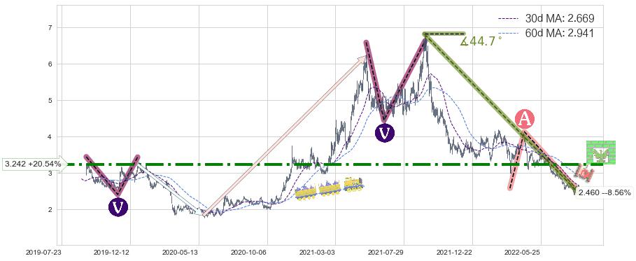 ♘ 阻力价格位3.242,可信任强度72.78%,距离最后交易2022-08-12形成的收盘价格2.690相差 +20.54%