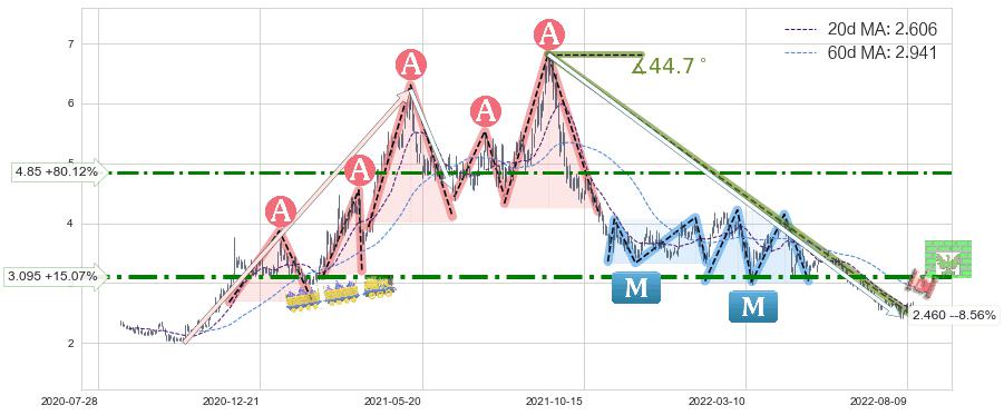 ♘ 阻力价格位3.095,可信任强度74.03%,距离最后交易2022-08-12形成的收盘价格2.690相差 +15.07%