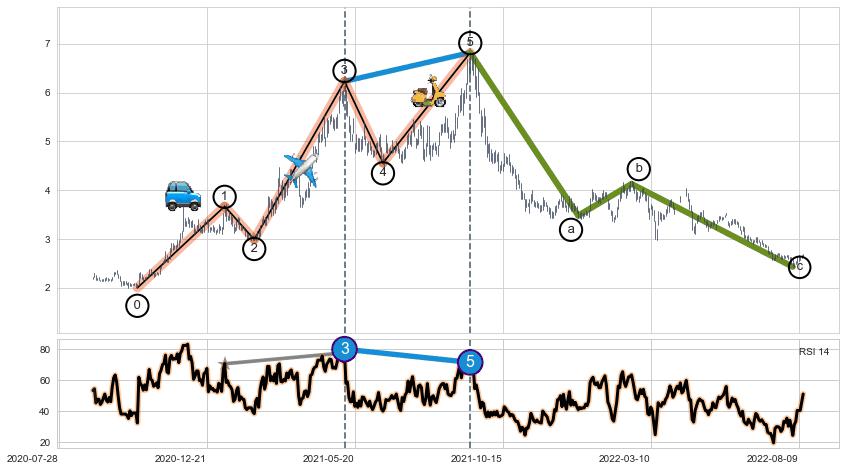 ➣ 波浪理论:猜想达到c点后小回调终止反转上涨 → 上涨 → 【拐点】临近 → 阶段均值回复结束后继续大周期趋势跟踪