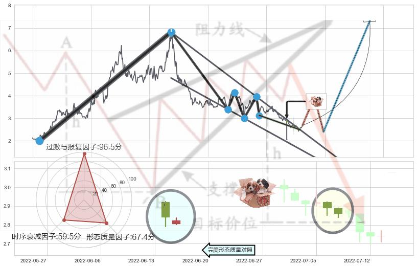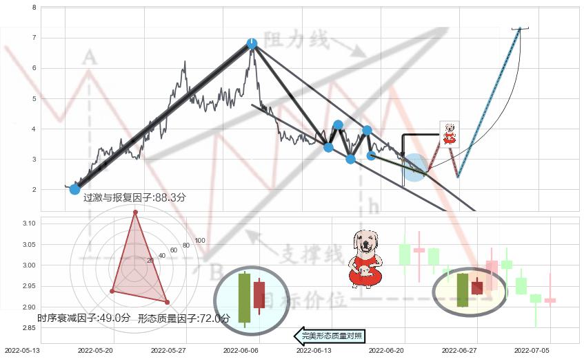 ➢ 🕰 价格走势在2022-07-06至2022-07-07期间形成底部尽头线(上山虎),残存影响值:2.38