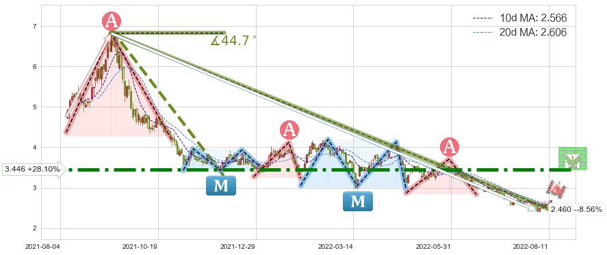 🦴 长线均值回复组合短线趋势跟踪[强阻力信号]2021-09-09-2022-08-11下跌趋势依然成立(下跌趋势跟踪依然存在),短线价格略微上行反弹(均值回复猜想),即将接近下跌趋势提供的未破位阻力价格:2.460。