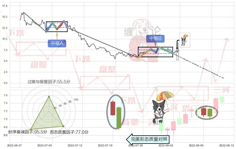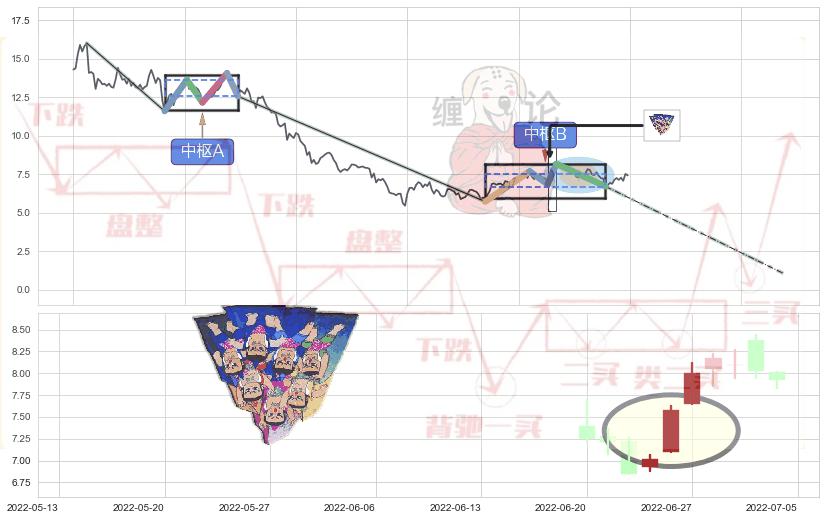 ➣ 【中枢B】:2022-05-12-2022-07-29,中枢由5笔构成,共55交易日, ZG=7.68, ZD=6.85