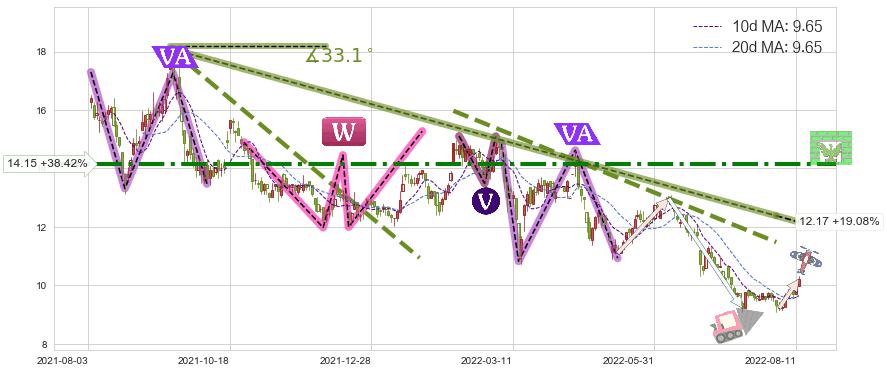 ♘ 阻力价格位14.15,可信任强度80.31%,距离最后交易2022-08-12形成的收盘价格10.22相差 +38.42%