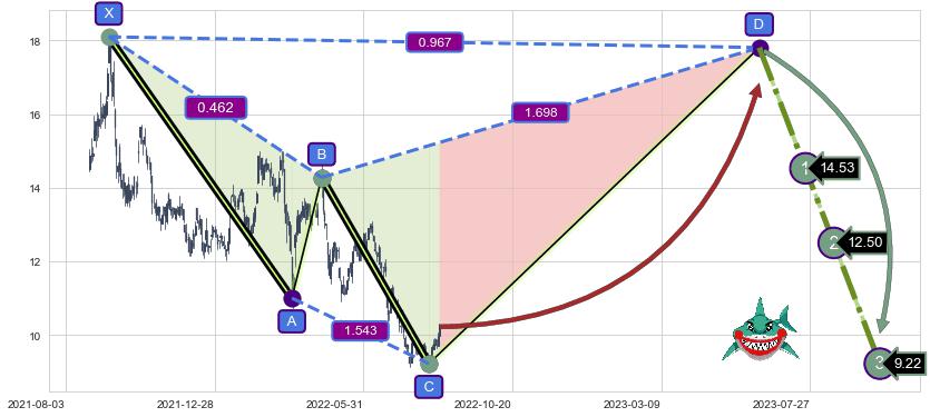 ➣ 未完成【鲨鱼】形态起点X: 2021-09-13, 已到达C点: 2022-08-03, 预测最终D点: 2023-06-09, 共438交易日