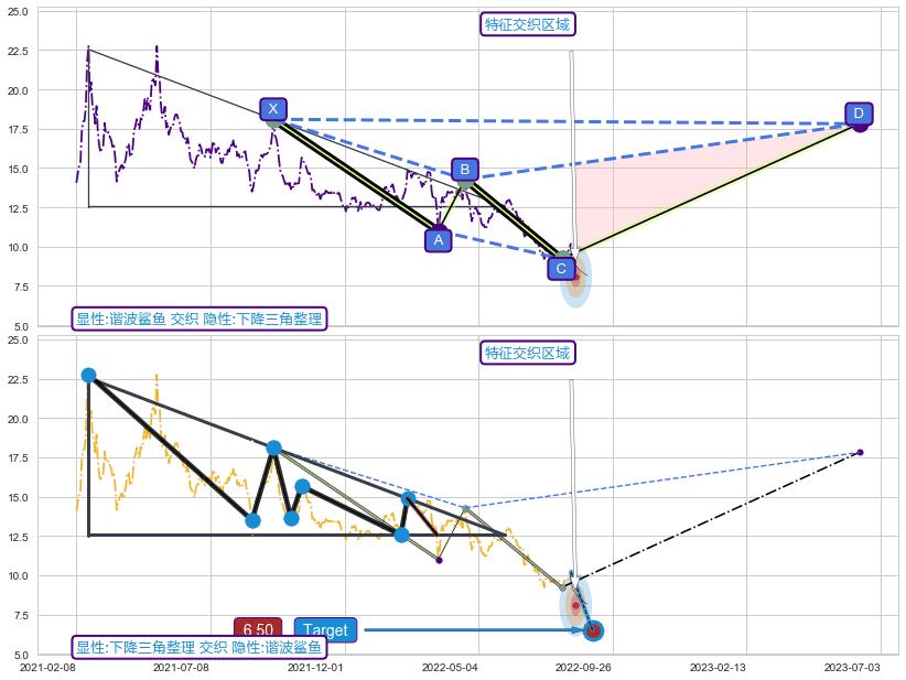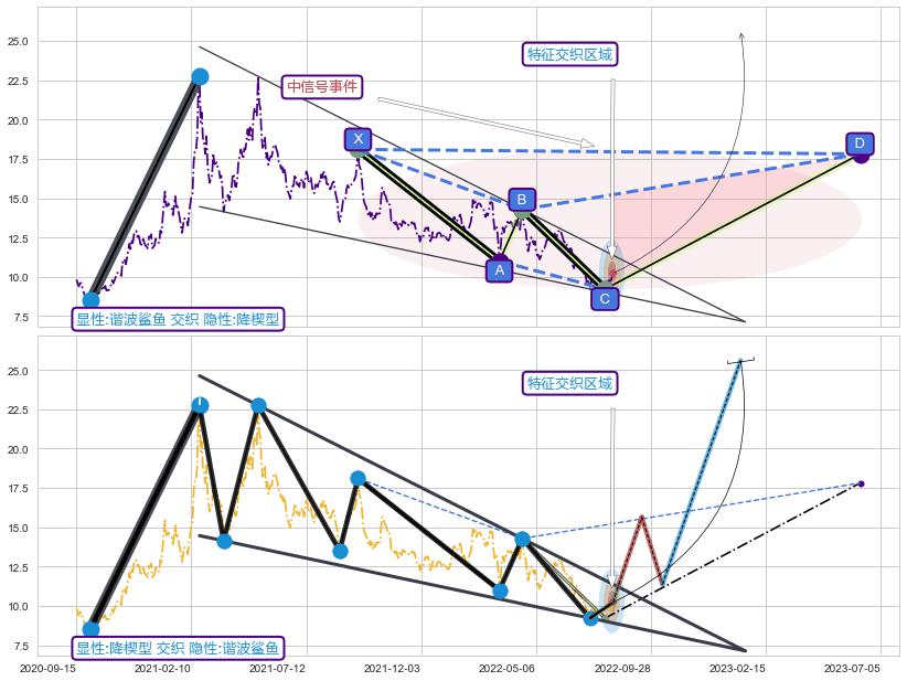 ➢ 谐波鲨鱼与下降三角整理信号事件周期长度级别相同,同周期信号事件
