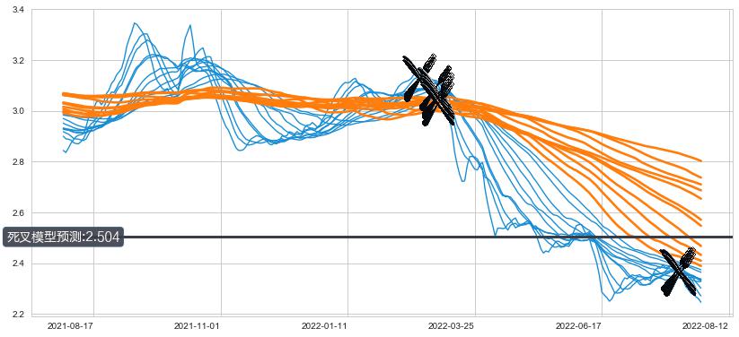 ➢ 30小时均线于(2022-08-01: 2.351)形成【死叉】基于【死叉历史模型】预测死叉后最低波谷价格: 2.152, 死叉后最低价格2.200,尚未达到预测最低波谷价格, 预期继续下跌