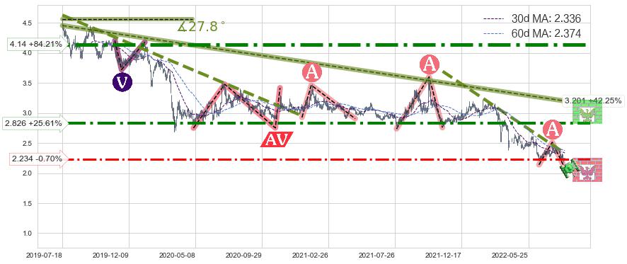 ♘ 阻力价格位2.826,可信任强度74.45%,距离最后交易2022-08-12形成的收盘价格2.250相差 +25.61%