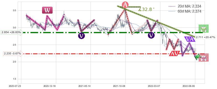 ♘ 支撑价格位2.235,可信任强度55.32%,距离最后交易2022-08-12形成的收盘价格2.250相差 -0.67%