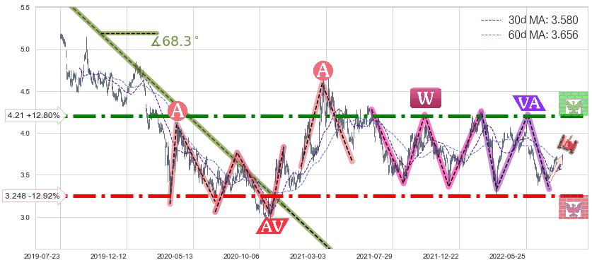 ♘ 支撑价格位3.248,可信任强度95.99%,距离最后交易2022-08-12形成的收盘价格3.730相差 -12.92%