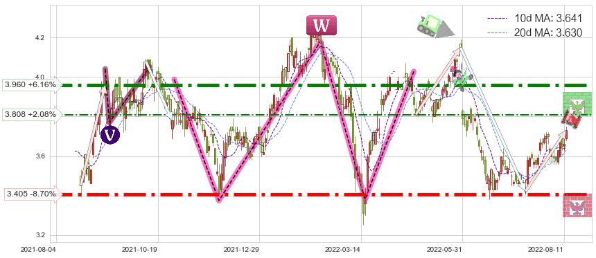 ♘ 阻力价格位3.808,可信任强度46.72%,距离最后交易2022-08-12形成的收盘价格3.730相差 +2.08%