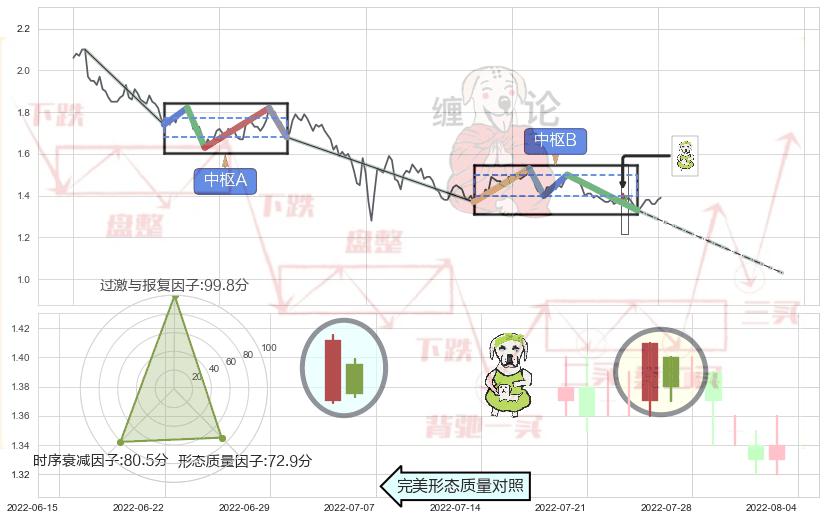 ➣ 【中枢B】:2022-05-12-2022-08-02,中枢由5笔构成,共57交易日, ZG=1.5000, ZD=1.4000