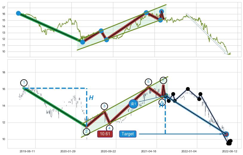 ➣ 升旗形:下跌目标target已达成:猜想强支撑位临近,预期反弹上涨(均值回复)