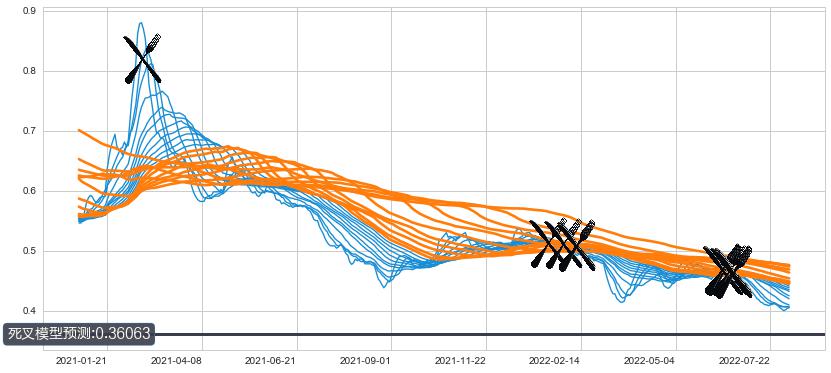 ➣ 60小时均线于(2022-06-22: 0.46292)形成【死叉】基于【死叉历史模型】预测死叉后最低波谷价格: 0.34599, 死叉后最低价格0.39500,尚未达到预测最低波谷价格, 预期继续下跌
