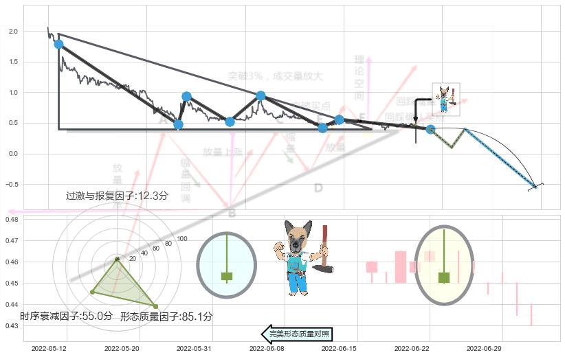 ➢ AI智能: 预测【多空防线逐步靠近→双方接火→空方占优】下降三角形中继整理向下突破,预测将在2022-08-12突破颈线, 演变成下降通道