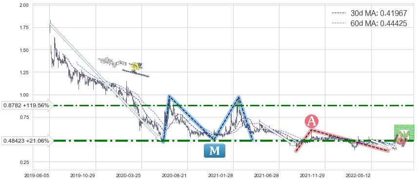 ♘ 阻力价格位0.48423,可信任强度77.04%,距离最后交易2022-08-12形成的收盘价格0.40000相差 +21.06%