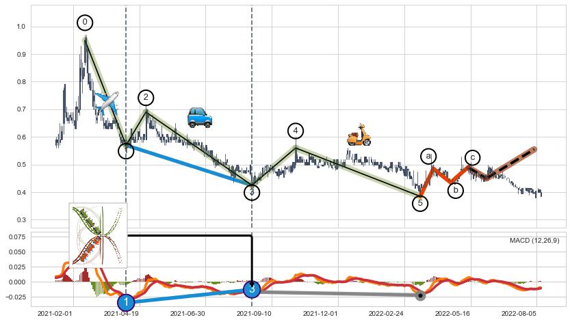 ➣ 波浪理论:猜想达到c点后小反弹终止反转下跌 → 下跌 → 【拐点】临近 → 阶段均值回复结束后继续大周期趋势跟踪
