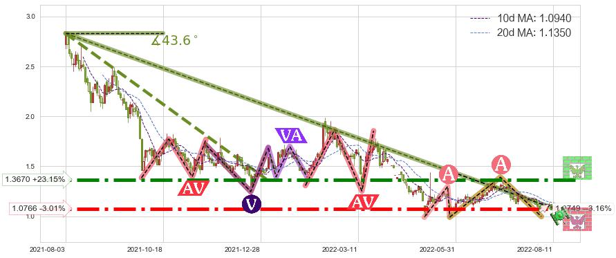 ♘ 阻力价格位1.3670,可信任强度90.15%,距离最后交易2022-08-12形成的收盘价格1.1100相差 +23.15%