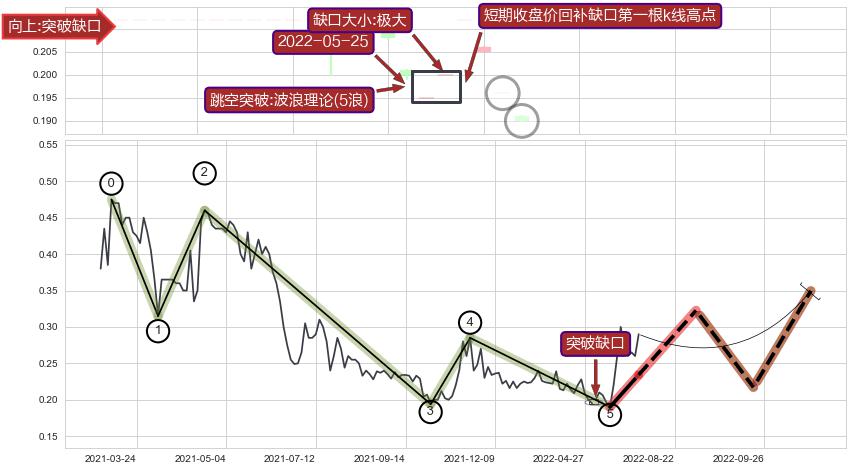 ➣ 突破缺口形成后,后续k已经超过7根,跳空突破波浪理论(5浪)关键点后, 出现【中度回踩】迹象,短期收盘价回补缺口第二根k线低点