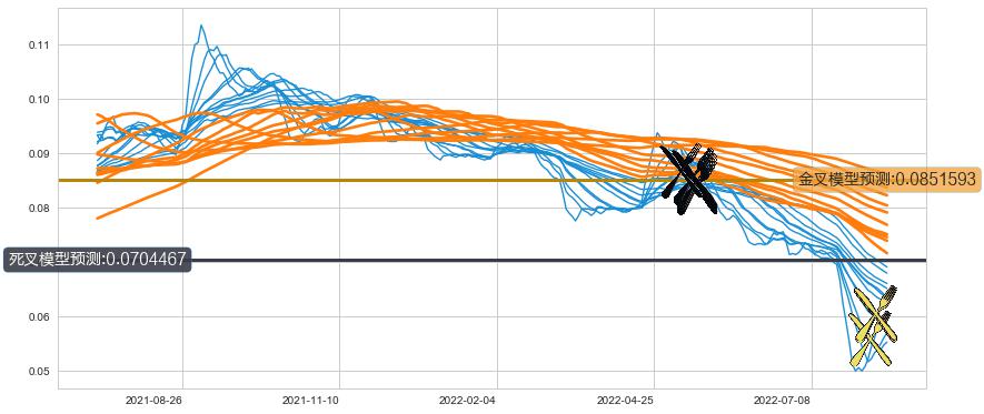 ➣ 70小时均线于(2022-05-13: 0.0857857)形成【死叉】基于【死叉历史模型】预测死叉后最低波谷价格: 0.0691383, 死叉后最低价格0.0480000,已经下跌超出预测最低波谷价格, 预期反弹