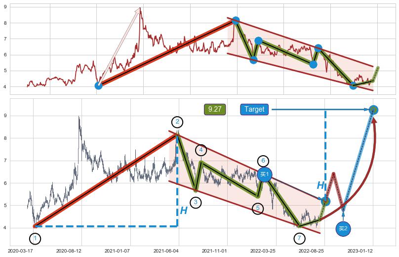 ➣ 降旗形:猜想临近关键阻力位突破点 → 临近拐点上涨 → 机会信号 → 大趋势均值回复