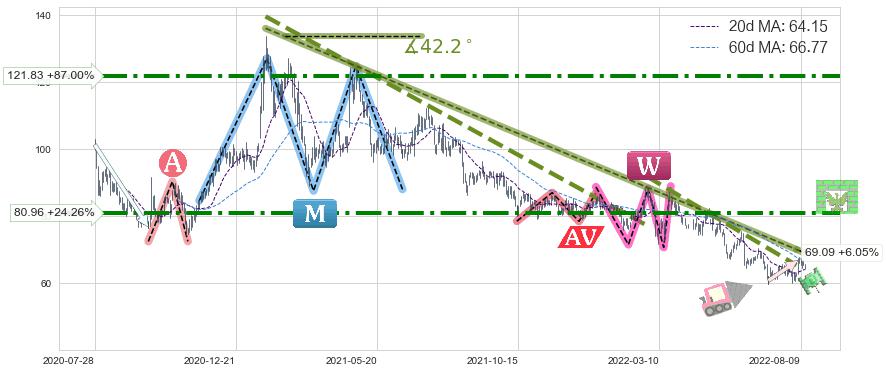 ♘ 在最后的下跌阶段2021-01-21至2022-08-04,存在 持续未破位的阻力位 ,阻力价格69.09,可信任强度82.26%,其距离最后价格65.15相差 +6.05%