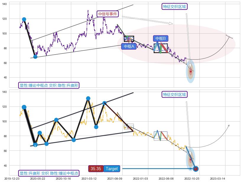 ➢ 【中枢B】:2022-02-08-2022-04-26,中枢由5笔构成,共52交易日, ZG=85.80, ZD=76.70