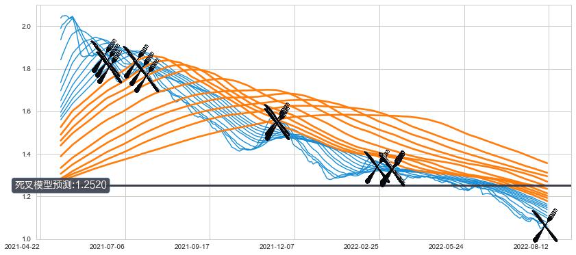 ➣ 10小时均线于(2021-11-22: 1.5570)形成【死叉】基于【死叉历史模型】预测死叉后最低波谷价格: 1.4830, 死叉后最低价格1.0300,已经下跌超出预测最低波谷价格, 预期反弹
