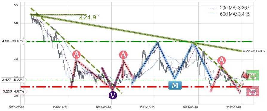 ♘ 阻力价格位4.50,可信任强度91.35%,距离最后交易2022-08-12形成的收盘价格3.420相差 +31.57%
