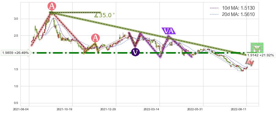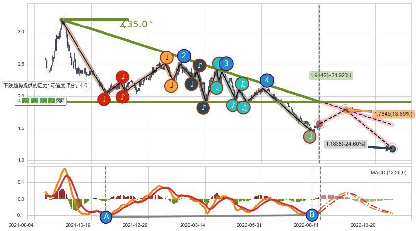 ♘ 在最后的下跌阶段2021-09-07至2022-08-11,存在 持续未破位的阻力位 ,阻力价格1.9142,可信任强度85.40%,其距离最后价格1.5700相差 +21.92%