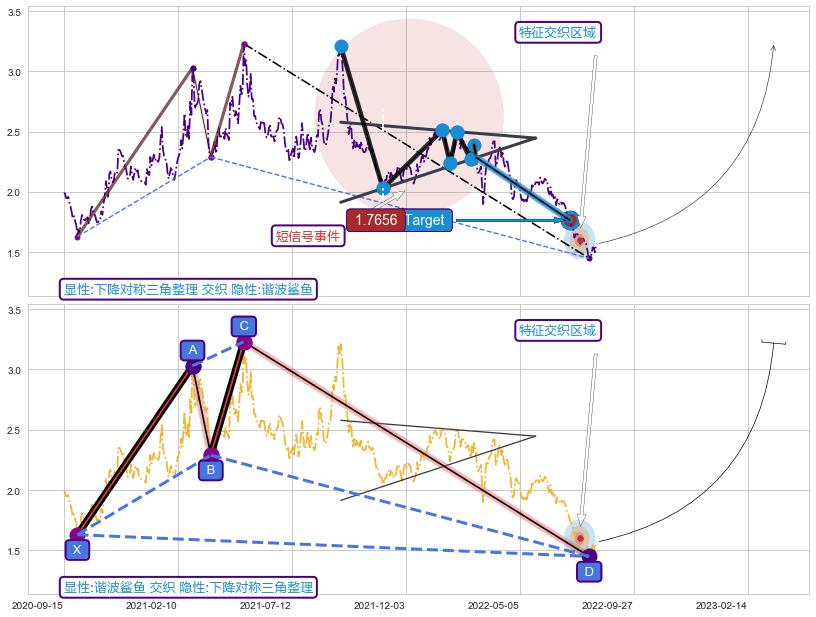 ➢ 下降对称三角整理属【短级别信号事件】谐波鲨鱼属【长级别信号事件】长短周期组合信号事件, 短长事件长度比26.67%