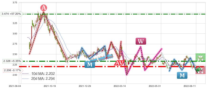 ♘ 阻力价格位2.328,可信任强度70.82%,距离最后交易2022-08-12形成的收盘价格2.210相差 +5.35%