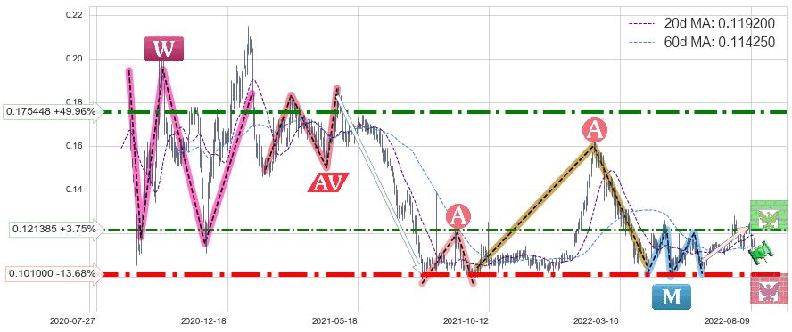 ♘ 阻力价格位0.175448,可信任强度81.47%,距离最后交易2022-08-12形成的收盘价格0.117000相差 +49.96%