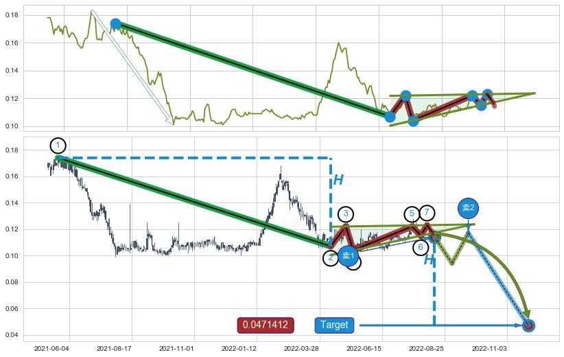 ➢ 最小中继整理跌幅→𝐇: 0.0670000 (𝐇楔型旗杆的长度:楔型起点→顶点)
