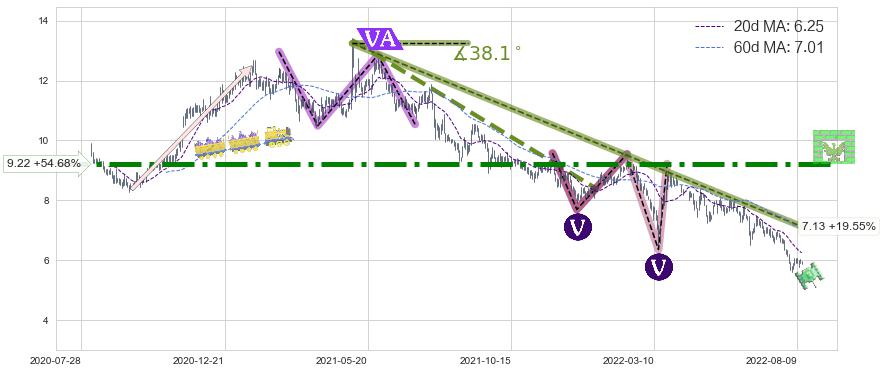 ♘ 阻力价格位9.22,可信任强度96.47%,距离最后交易2022-08-12形成的收盘价格5.96相差 +54.68%