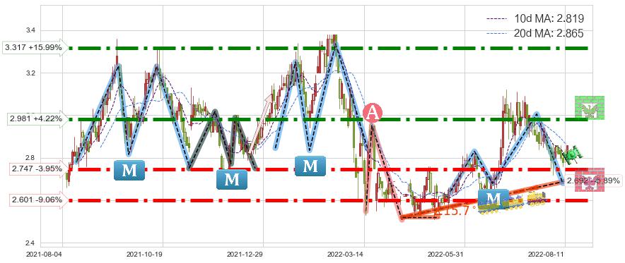 ♘ 支撑价格位2.747,可信任强度90.62%,距离最后交易2022-08-12形成的收盘价格2.860相差 -3.95%