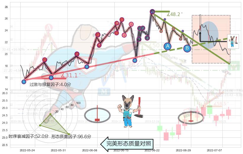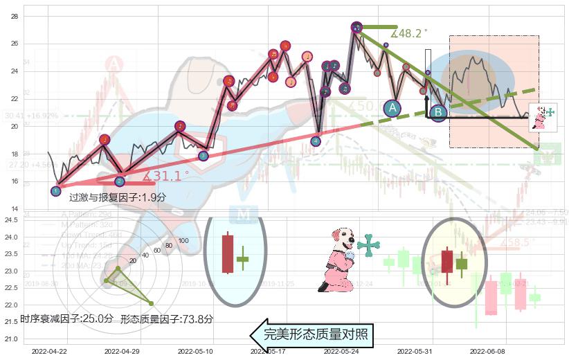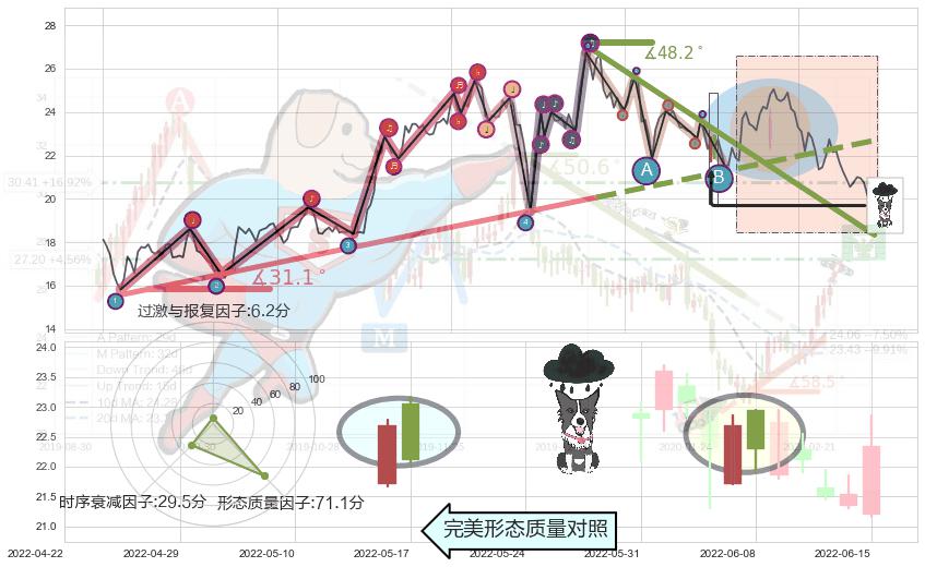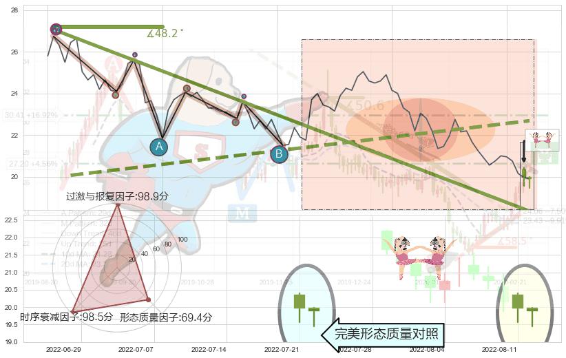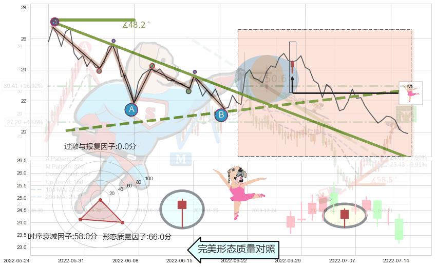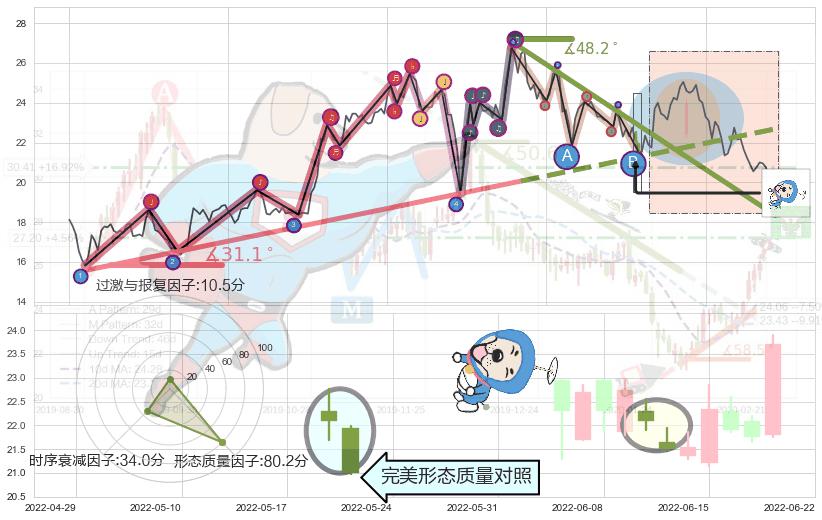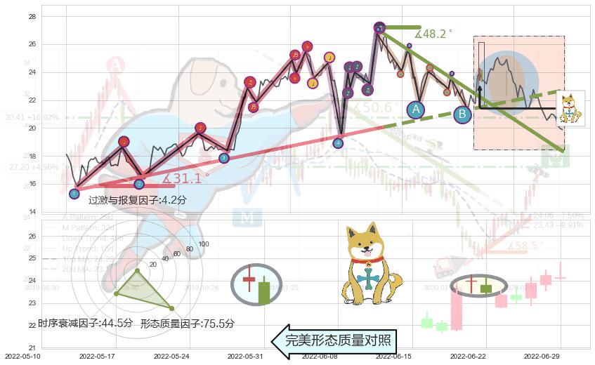 从2022-04-08至2022-06-30,共包含54个交易日,阶段股价下跌-5.48%,阶段股价变动位移路程比: 1 : 20,下跌趋势角度: 48.2